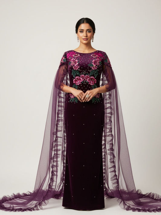 Turn heads in this elegant satin dress, paired with a beautifully embroidered cape for a...