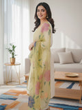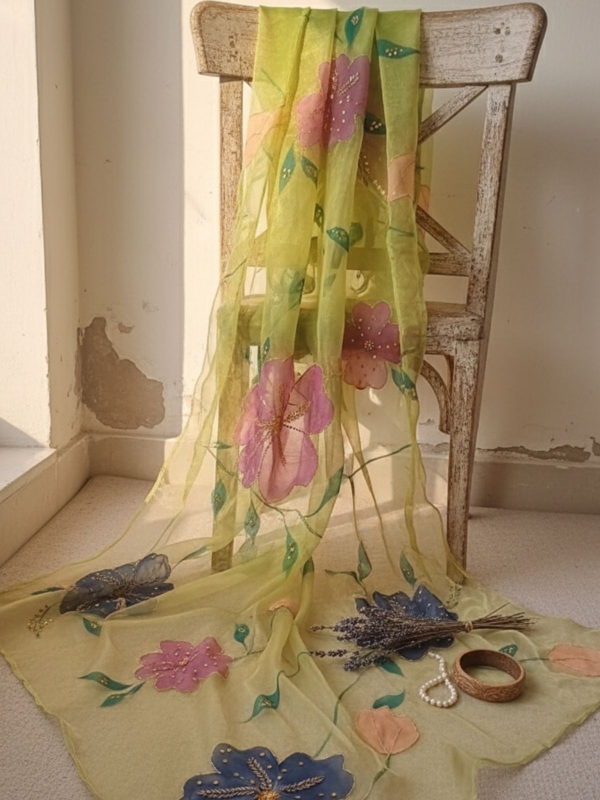 Elevate your ethnic wardrobe with this exquisite handpainted green organza dupatta, a perfect blend of artistry and elegance. Crafted on a sheer, lightweight organza fabric, this dupatta features delicate handpainted motifs that add a unique, artistic charm to its overall appeal.