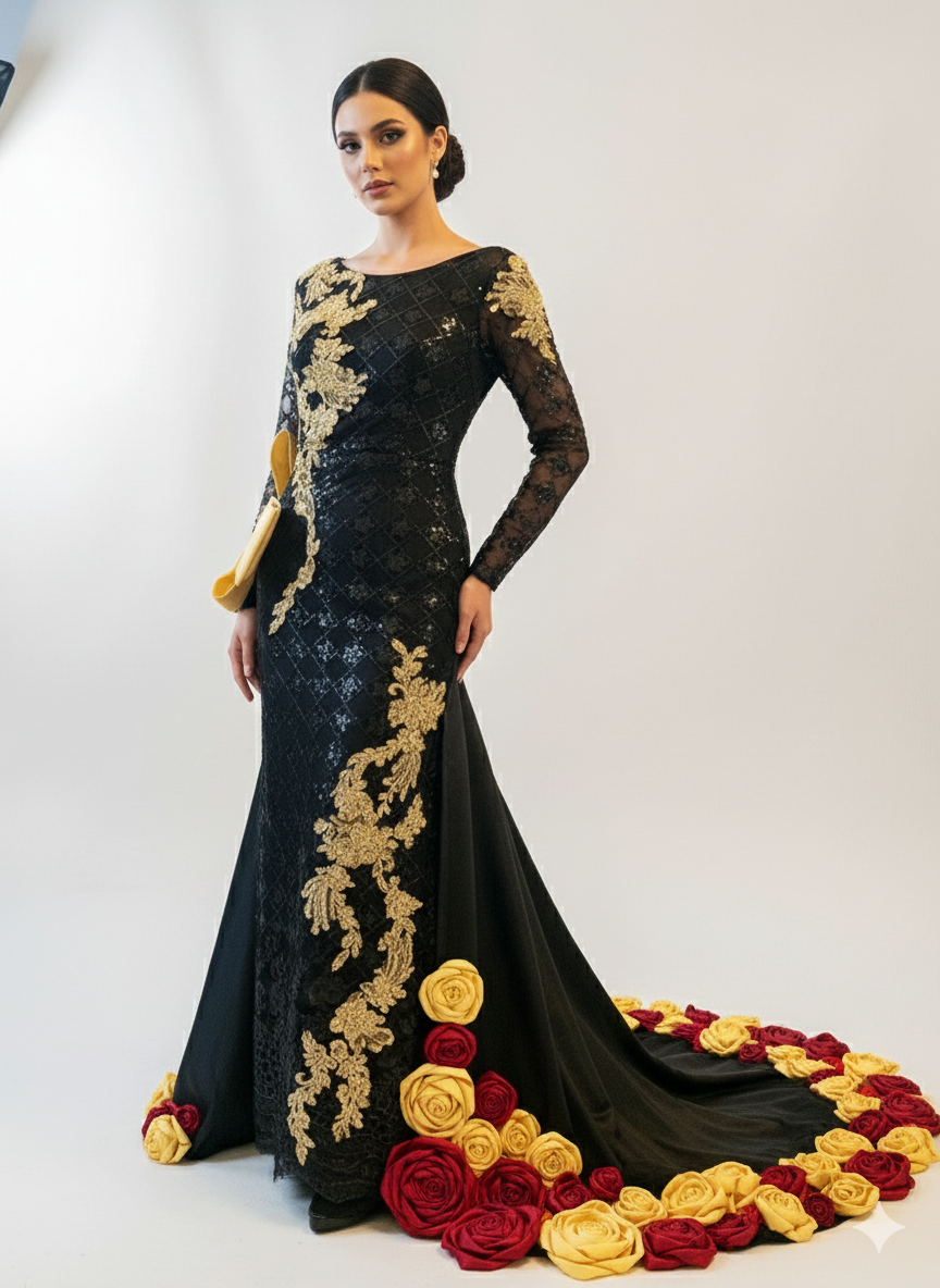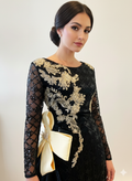 Elevate your evening look with this stunning black dress, featuring a delicate black net overlay and intricate gold embroidery appliqués. The shimmering gold accents add a touch of luxury, while the sheer layers create a graceful, ethereal silhouette—perfect for special occasions and elegant soirées.